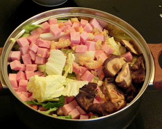 На четыре человека надо будет четверть наппы, пару ст.л. сушеных креветок, штук 5-6 сушеных грибов, поллитра бульона и грамм 100-150 ветчины.